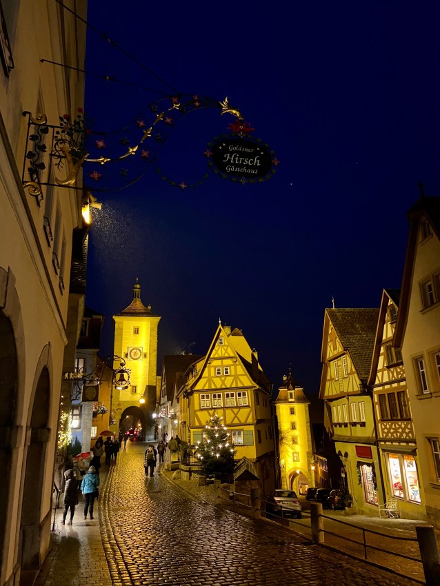 We spent time exploring the booths and of course tasting the Glühwein and decided to walk down to the Plönlein which is the square where the famous crooked yellow house sits. It was quite a site with the snow coming down and holiday lights all around.