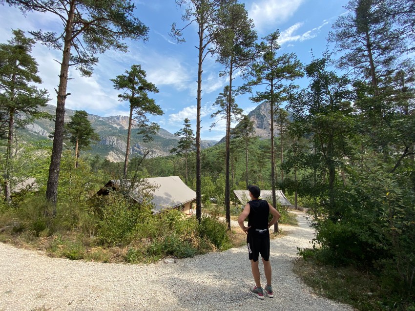 Our week in Sainte-Maxime came to an end. I would normally be sad as I hate leaving the beach but we had a fun little adventure ahead and still a week of holiday. We packed up the car and headed for the mountains. Our next leg was camping and outdoor fun in the Verdon Natural Regional Park. We were leaving the glam of Saint Tropez for a few days of glamping in the woods. Our trek started a little sketchy with the main highway being closed. Google re-routed us up through the mountains via a road that was really no wider than one car (although it was supposed to be two lanes) with no guard rails and it was crazy hot. The drive was beautiful but a bit too windy for our little guy who forced a pit stop half way to decorate the car with his breakfast. After a short pause and attempt to clean the car we got back on the road and made our way to Bauden, a cute village on the Lake of Sainte-Croix which is at the base of the Verdon River. We had a nice stroll around town to stretch our legs and ate lunch at Le Bouchon. From Bauden we took the D957 up and around the lake on the East side crossing the Pont du Galetas (Gelatas Bridge). As we started our climb up onto the rim of the canyon we connected with Highway D952 which takes you winding along with the river below but from the top of the canyon providing insane views and drops that were a bit nerve wracking at times.